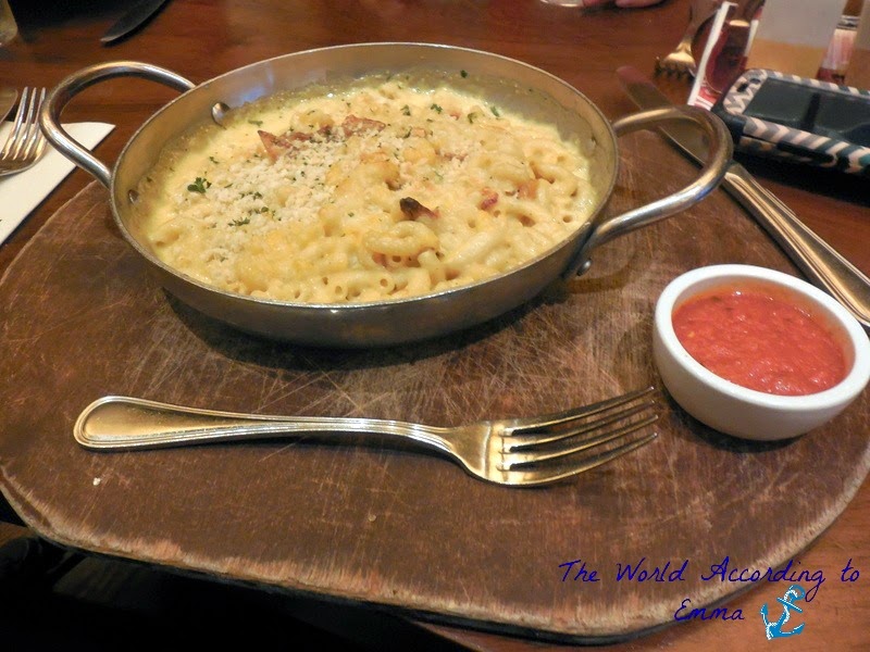 For food the menu all looked delicious. It was mainly American foods, a lot of burgers and sandwiches. But they also had some pasta dishes and I think pizza. I got a Mac & Cheese meal because I believe if Mac and Cheese is on the adult menu then I must get it. It originally comes with bacon and roasted tomatoes in it but I got it with out the tomatoes. On the side it comes with tomato sauce and it was delicious to combine the two flavors.